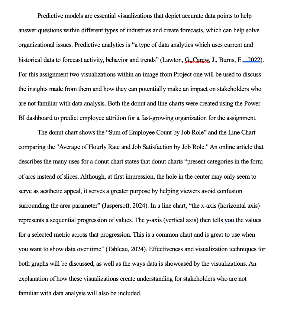 This project focused on demonstrating the value of predictive visualizations in answering real organizational questions through clear, accessible dashboards. Using Power BI, I designed and interpreted visualizations that forecasted employee attrition trends in a fast-growing organization. The assignment emphasized how predictive models can transform raw data into strategic insights for stakeholders — even those with limited technical backgrounds.